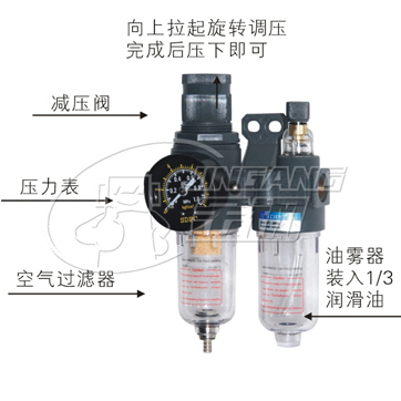 該氣源處理三聯件包括空氣減壓閥,過濾器、油霧器三大件。其中威壓閥可對氣源進行穩壓,使氣源處于恒定狀態,可減小因氣源氣壓突變時對閥門或執行器等到硬件的損傷。過濾器用于對氣源的清潔。可過濾壓縮空氣中的水分,避免水分隨氣體進入裝置。油霧器可對機體運動部件進行潤滑。可以對不方便加潤滑油的部件進行潤滑,大大延長機體的使用壽命。o